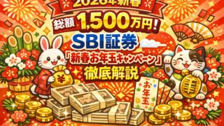 投資 【2026年新春】総額1,500万円!SBI証券「新春お年玉キャンペーン」徹底解説 はじめにSBI証券では、SBIグループ累計1,500万口座達成を記念して、総額1,500万円がもらえる新春お年玉キャンペーンを開催しています。投資信託を1万円買うだけで参加でき、さらに株取引をすると当選確率&もらえる金額アップのチャンスも。... 2026.01.02 投資
