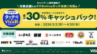 はじめに三井住友カードが、ビザ・ワールドワイドと共同で実施する超お得キャンペーンがスタート!対象飲食店でスマホのVisaタッチ決済を利用すると、最大30%キャッシュバックが狙える注目企画です。合わせて読みたい【2026年3月2日開始】Vis...
