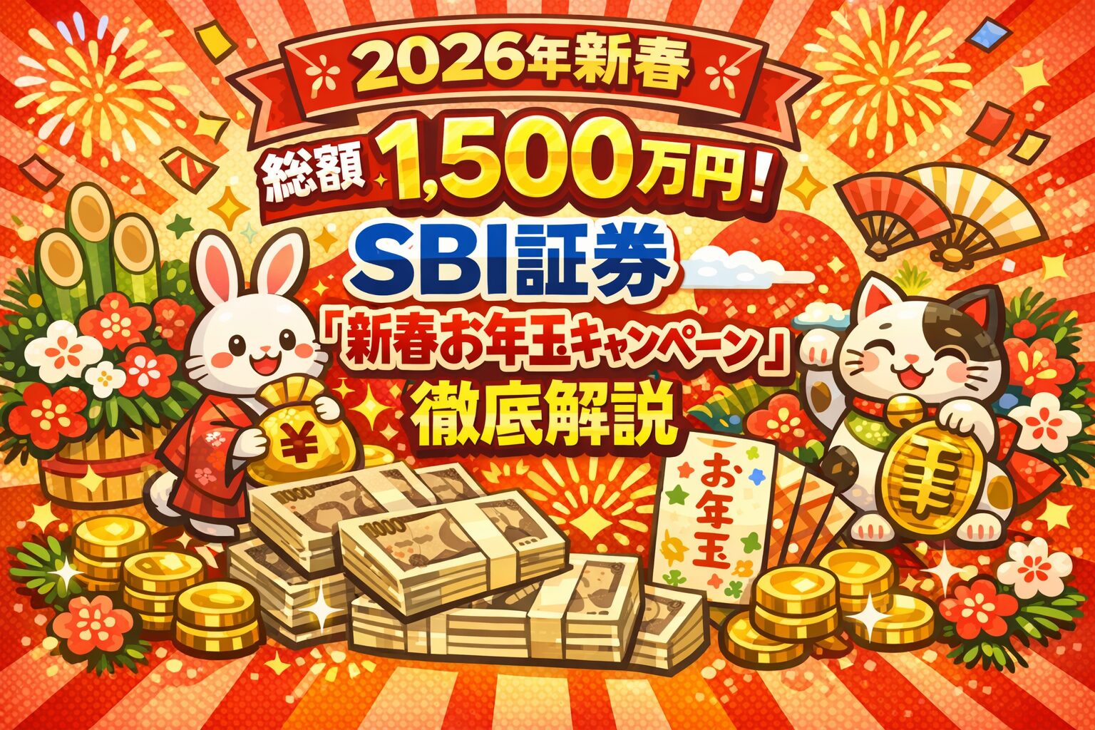 SBI証券では、SBIグループ累計1,500万口座達成を記念して、総額1,500万円がもらえる新春お年玉キャンペーンを開催しています。